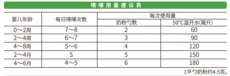 平勺奶粉 依照喂哺用量建議表,加入正確份量(平勺)的奶粉,請勿刻意壓平量勺。